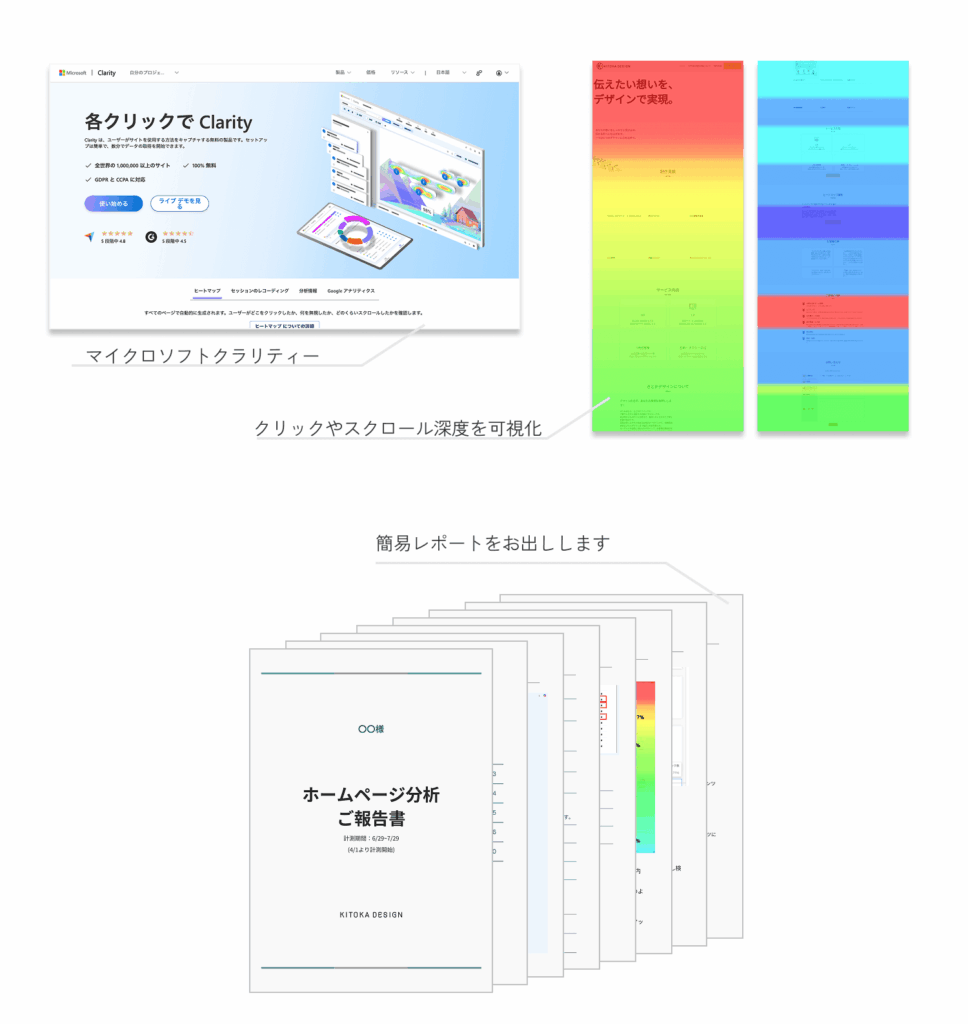 検証レポート:修正デザインの納品後、約1ヶ月 or 1000PVを目安に、再度ユーザー行動の解析結果をご案内します。