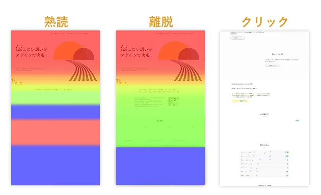3種のヒートマップでユーザー行動を色と数値で可視化できます。